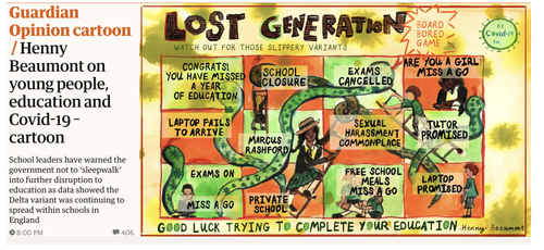 She also referred to those whose lives she depicted in the winning image. “The cartoon is dedicated to all the young people who missed out on so much during lockdown, had such a tough time and took so seriously their responsibility to protect those more vulnerable than themselves.’” The Guardian.